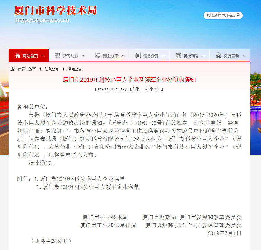 近日,廈門市科學(xué)技術(shù)局公布了廈門市2019年科技小巨人企業(yè)及領(lǐng)軍企業(yè)名單,廈門安科科技有限公司(下簡稱:廈門安科)作為極具潛力的新興企業(yè)代表榮獲“廈門市科技小巨人領(lǐng)軍企業(yè)”稱號。科技小巨人領(lǐng)軍企業(yè)是省科技廳、省發(fā)改委、省工信廳、省財政廳根據(jù)《福建省人民政府辦公廳關(guān)于印發(fā)培育科技小巨人領(lǐng)軍企業(yè)行動計劃(20···
