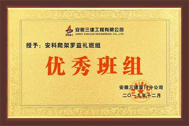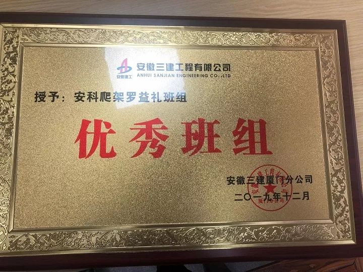 ?廈門(mén)安科榮獲安徽三建廈門(mén)分公司頒發(fā)的2019年“優(yōu)秀班組”榮譽(yù)證書(shū)
