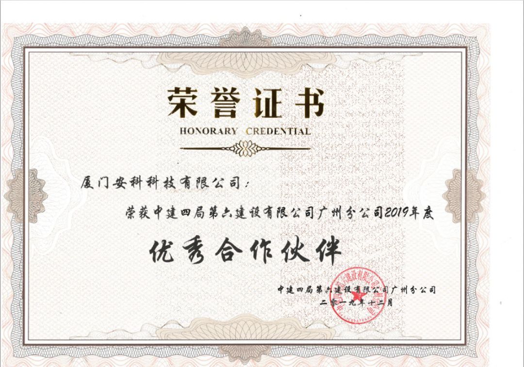 ?廈門(mén)安科榮獲中建四局第六建設(shè)有限公司廣州分公司頒發(fā)的2019年年度“優(yōu)秀合作伙伴”榮譽(yù)證書(shū)