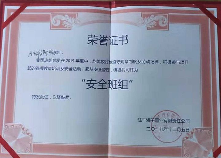 ?廈門(mén)安科榮獲陸豐海王置業(yè)有限責(zé)任公司頒發(fā)的2019年“安全班組”榮譽(yù)證書(shū)