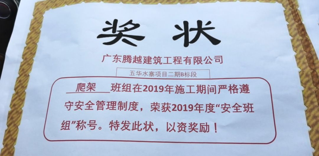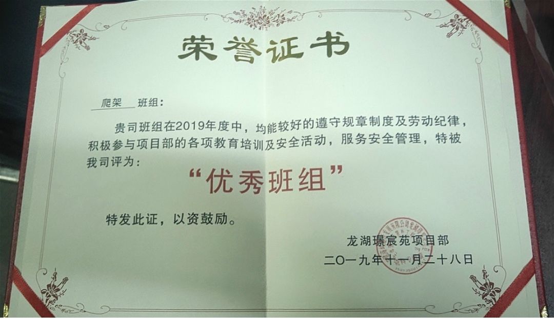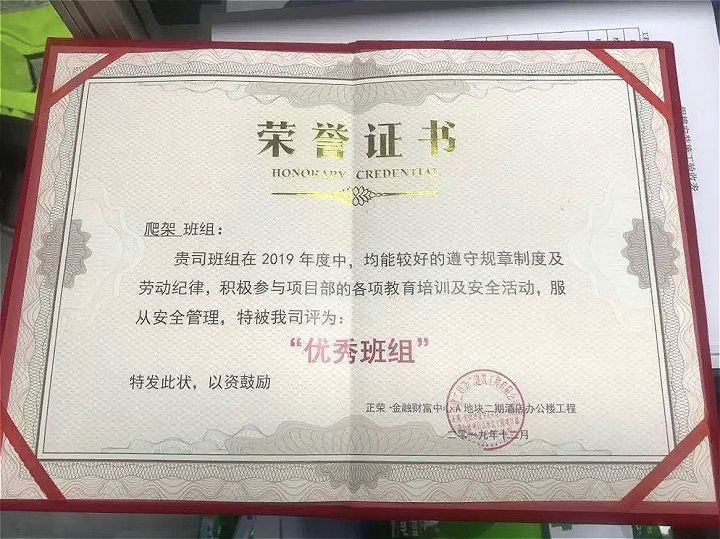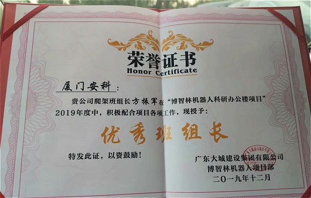 ?廈門(mén)安科爬架班組長(zhǎng)方振軍獲廣東大城建設(shè)集團(tuán)有限公司頒發(fā)的2019年“優(yōu)秀班組長(zhǎng)”榮譽(yù)證書(shū)