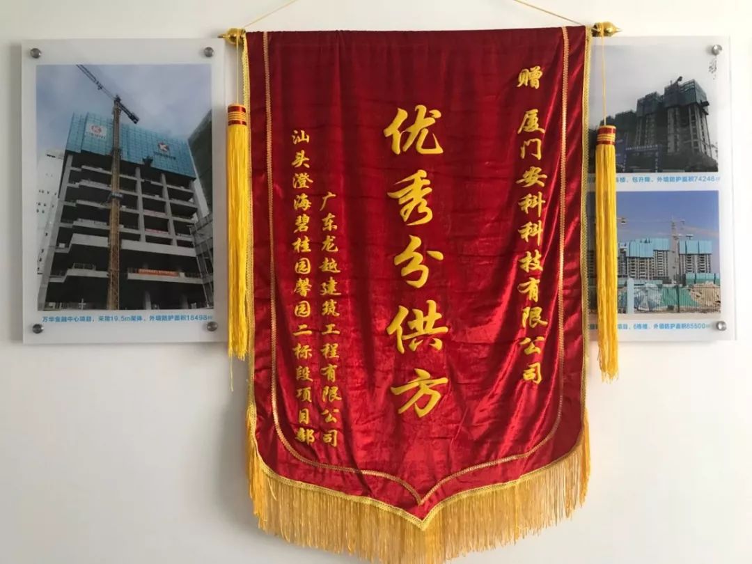 廈門(mén)安科獲碧桂園集團(tuán)和廣東龍?jiān)浇ㄖこ逃邢薰?/span>共同頒發(fā)的“優(yōu)秀分供方”榮譽(yù)錦旗