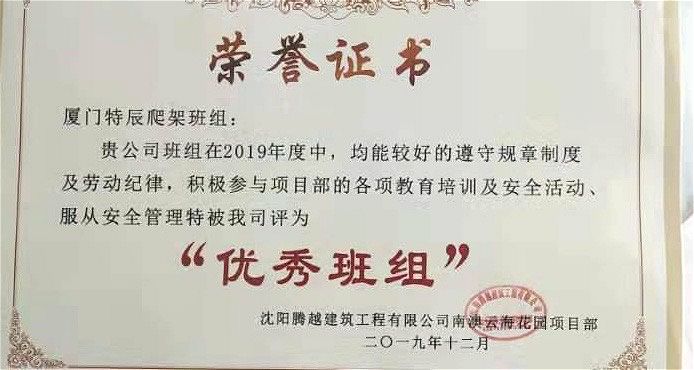 ?廈門(mén)安科旗下全資子公司—廈門(mén)特辰科技有限公司榮獲沈陽(yáng)騰越建筑工程有限公司頒發(fā)的2019年“優(yōu)秀班組”榮譽(yù)證書(shū)
