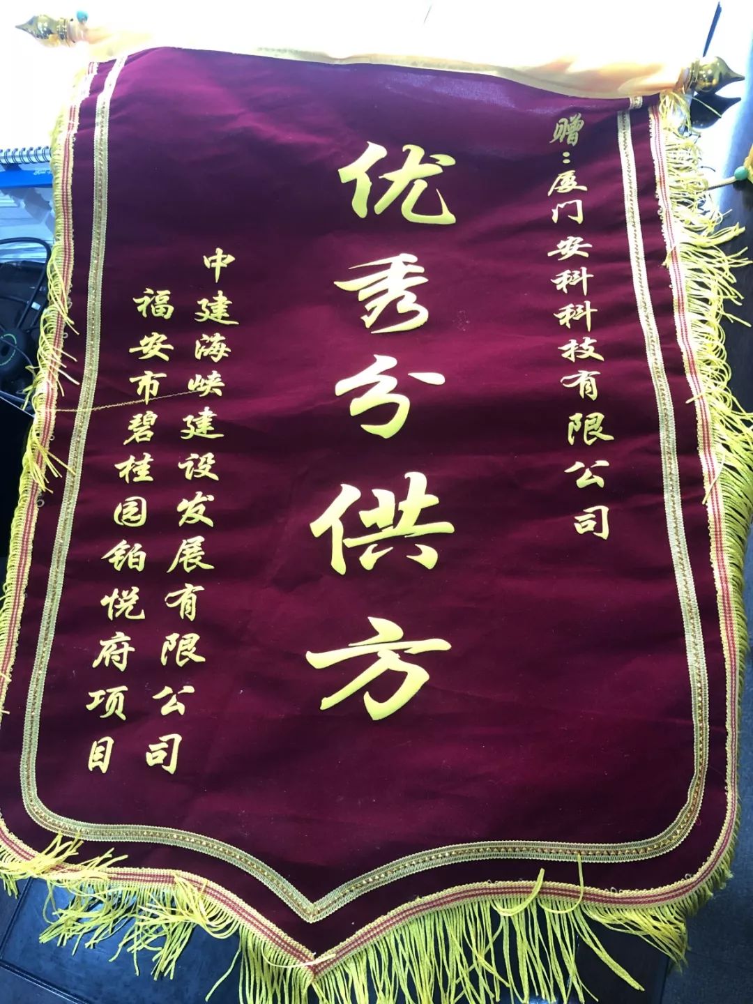 廈門(mén)安科獲中建海峽建設(shè)發(fā)展有限公司頒發(fā)的“優(yōu)秀分供方”榮譽(yù)錦旗