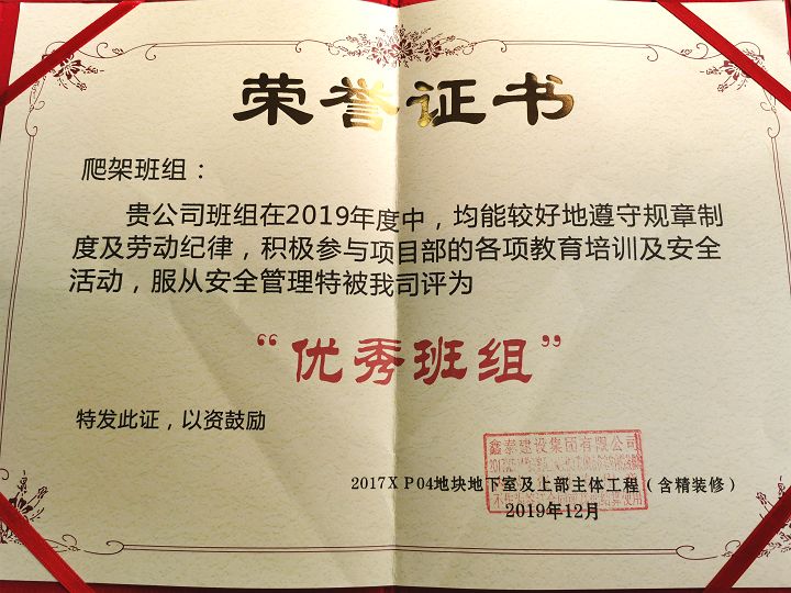 ?廈門(mén)安科榮獲福建鑫泰建筑集團(tuán)有限公司頒發(fā)的2019年“優(yōu)秀班組”榮譽(yù)證書(shū)