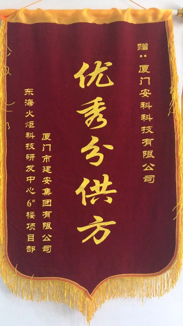 廈門(mén)安科獲廈門(mén)市建安集團(tuán)有限公司頒發(fā)的“優(yōu)秀分供方”榮譽(yù)錦旗