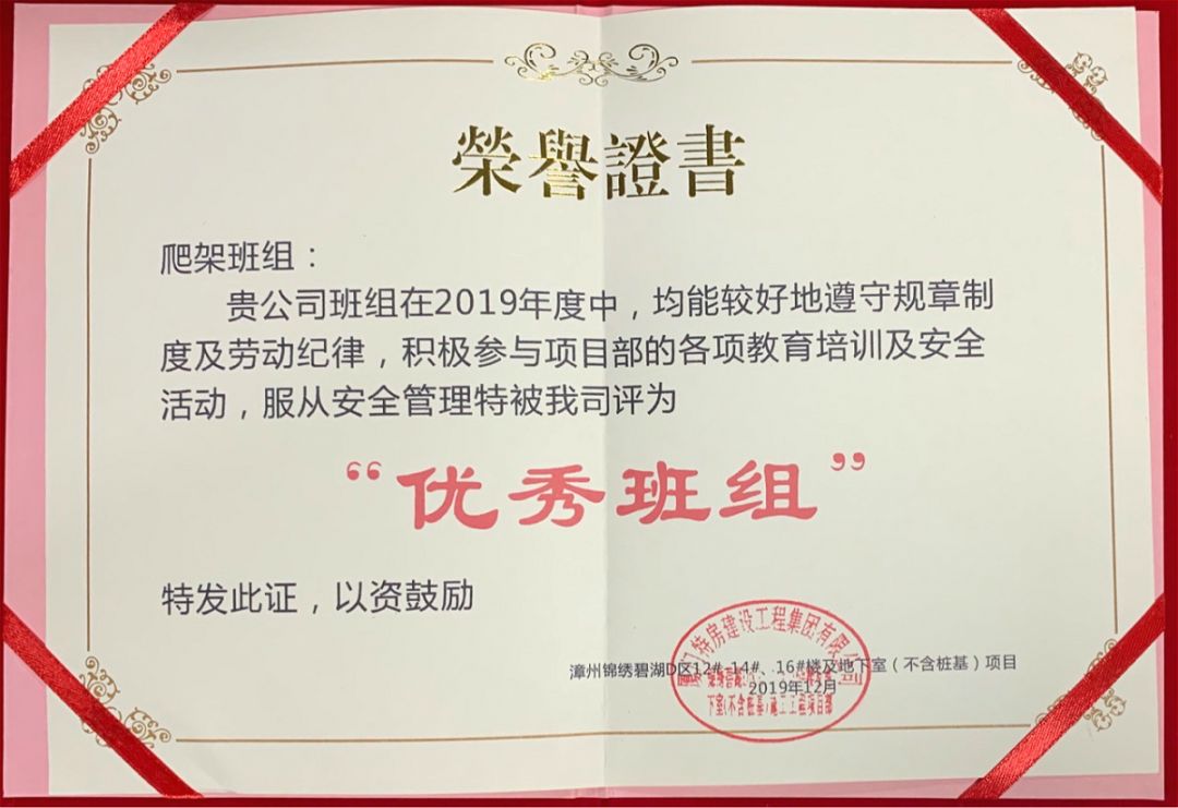 ?廈門(mén)安科榮獲廈門(mén)特房建設(shè)工程集團(tuán)有限公司頒發(fā)的2019年“優(yōu)秀班組”榮譽(yù)證書(shū)