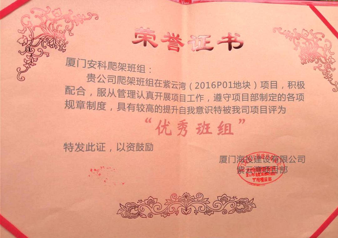 ?廈門(mén)安科榮獲廈門(mén)海投建設(shè)有限公司頒發(fā)的“優(yōu)秀班組”榮譽(yù)證書(shū)
