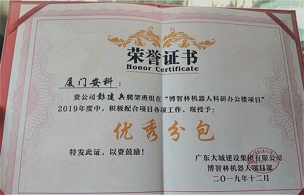 ?廈門(mén)安科榮獲廣東大城建設(shè)集團(tuán)有限公司頒發(fā)的2019年“優(yōu)秀分包”榮譽(yù)證書(shū)