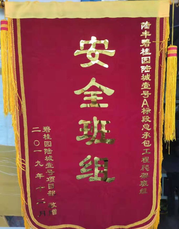 廈門(mén)安科獲碧桂園集團(tuán)和黑龍江省建工集團(tuán)共同頒發(fā)的“安全文明模范班組”榮譽(yù)錦旗