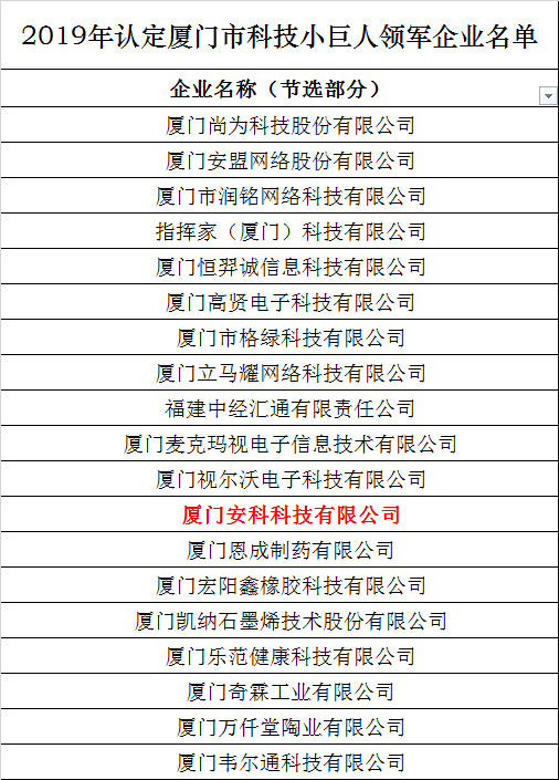 本次評選出的新興產業企業均具有一定的經濟規模、良好的信用,較高的綜合實力水平(經濟規模、創新體系、科研實力及投入力度、品牌資產等)。此次獲得「廈門市科技小巨人領軍企業」殊榮,是省科技廳等部門對廈門安科綜合實力的充分肯定和鼓勵。