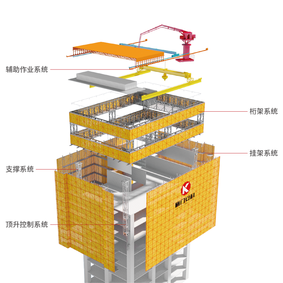 • 一體化設計:整體式吊掛模板+一體式集成布料機,可隨平臺爬升同步提升,作業過程安全高效。